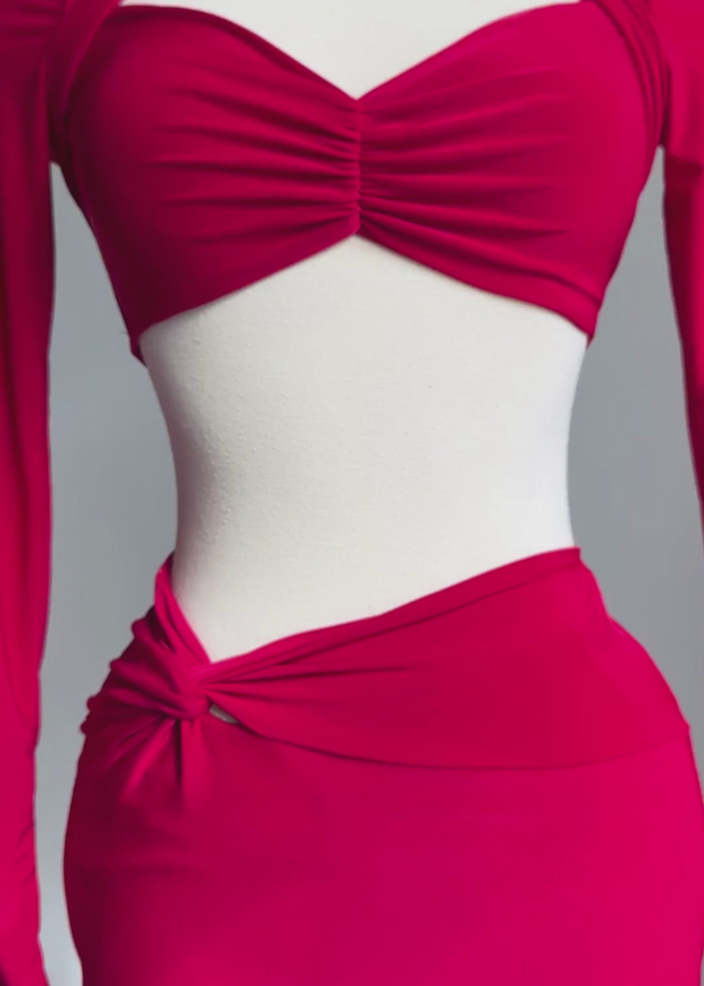 This set features a long-sleeve front cutout top with front twist detail bottom. The skirt is low rise to give y2k vibes. The whole set is very stretchy and brings sexy feels wearing it.
