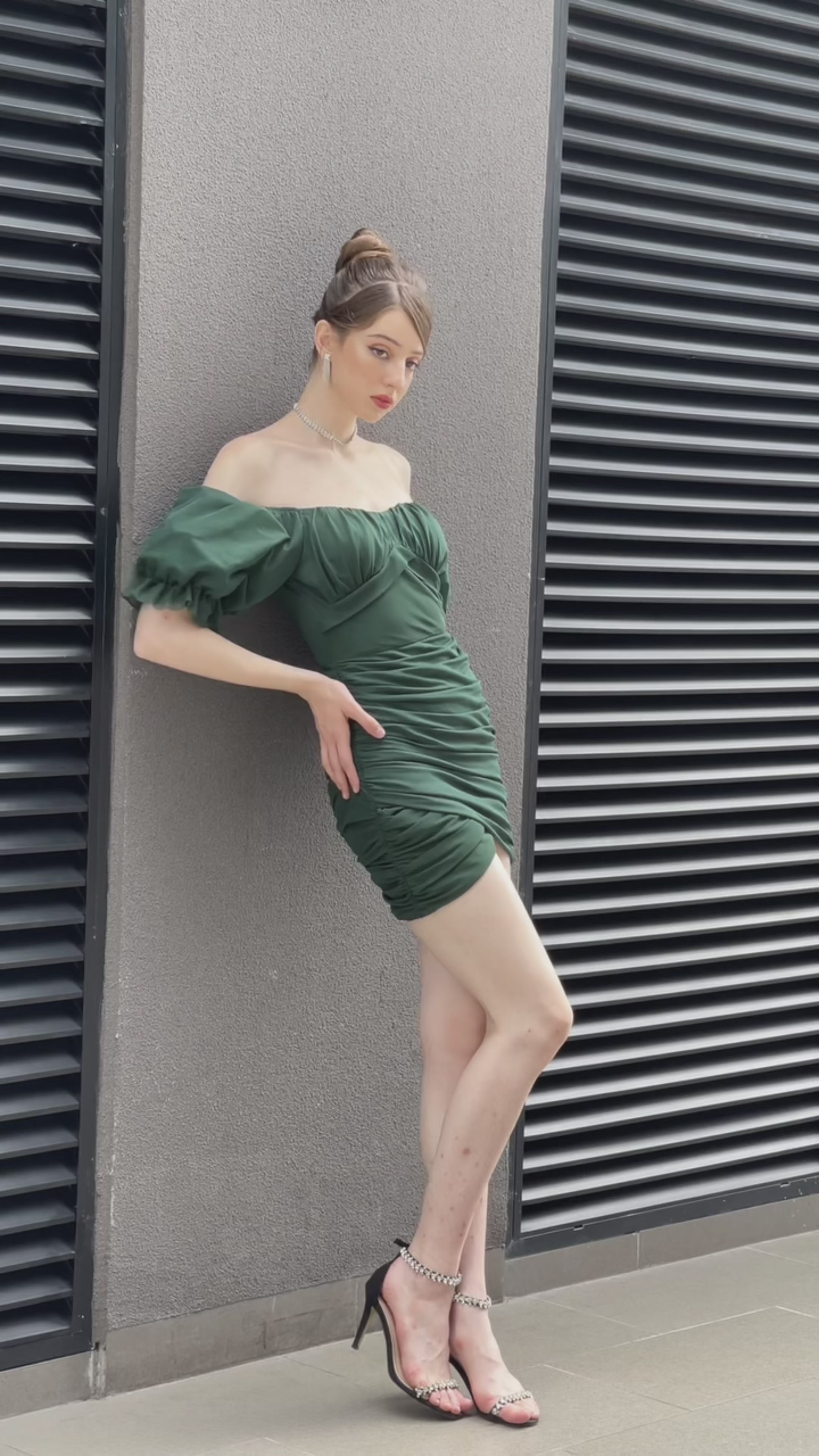 Introducing the Etherea dress, a mesmerizing embodiment of elegance and allure. This mini bodycon dress redefines sophistication, featuring a luxurious blend of style and comfort. The dress boasts voluminous puff sleeves, making a bold statement while adding a touch of playfulness to your look. Versatility meets chic design as the dress can be effortlessly worn off the shoulder for a flirtatious charm or elegantly pulled onto the shoulders for a more classic appeal. The dress comes with delicate cup pads, ensuring a perfect fit and enhancing your natural silhouette. Its asymmetrical bottom adds a contemporary edge, catching the eye with every step you take. The Etherea dress is completed with a hidden zipper, allowing for seamless wear and highlighting its flawless craftsmanship. Embrace the essence of femininity and luxury with this enchanting dress, designed to make you feel confident and captivating at every occasion.