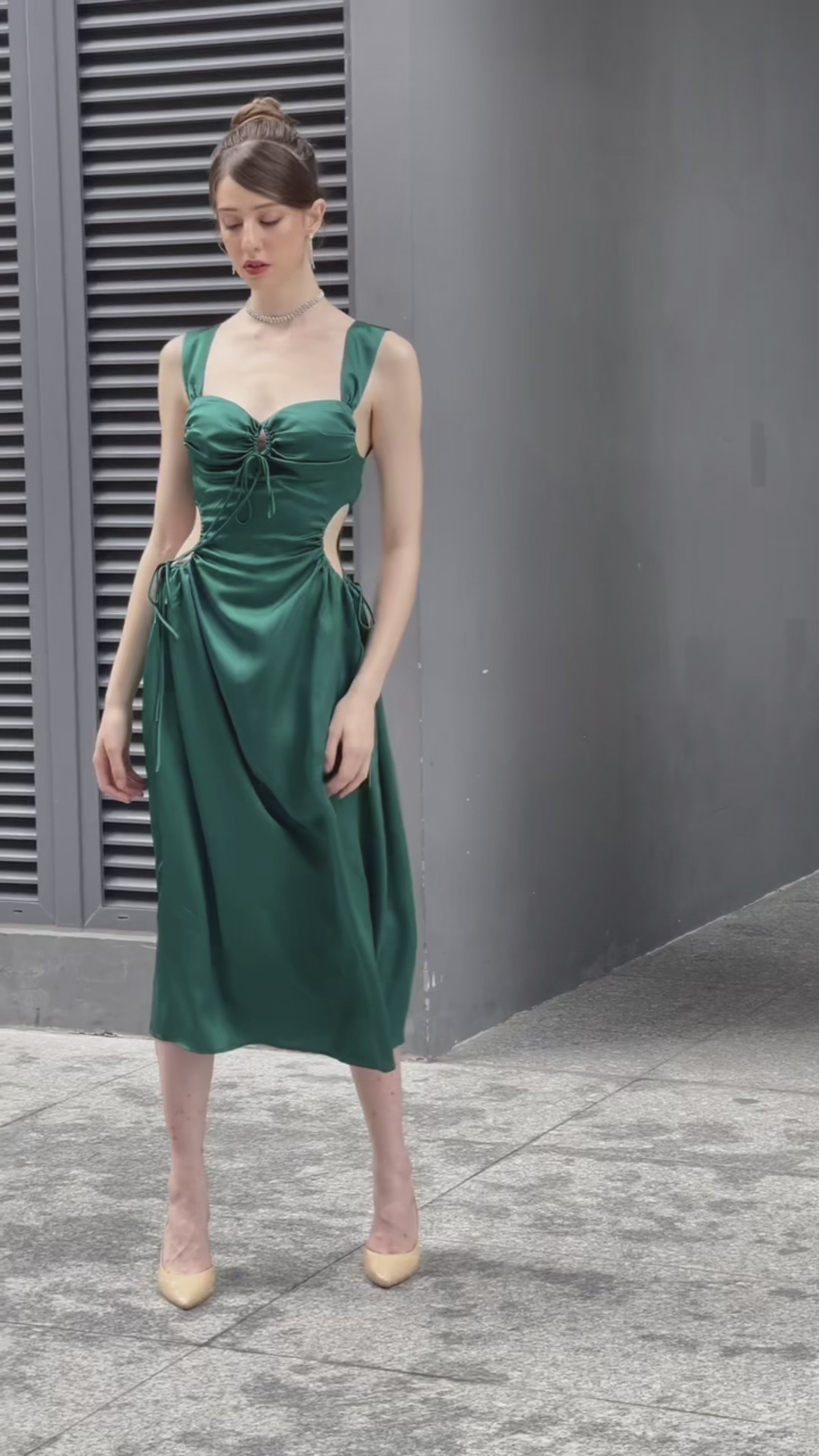 Indulge in the epitome of elegance with our Lumina A-line dress, expertly crafted from luxurious satin that flows gracefully with every step. This enchanting dress features delicate cup pads for subtle shaping and a captivating cut-out waist adorned with adjustable strings, allowing you to customize the fit to your liking. Effortlessly slip into sophistication with the hidden zipper, ensuring seamless wear. Perfect for any occasion, this dress embodies femininity, allure, and modern charm, making you the center of attention wherever you go.