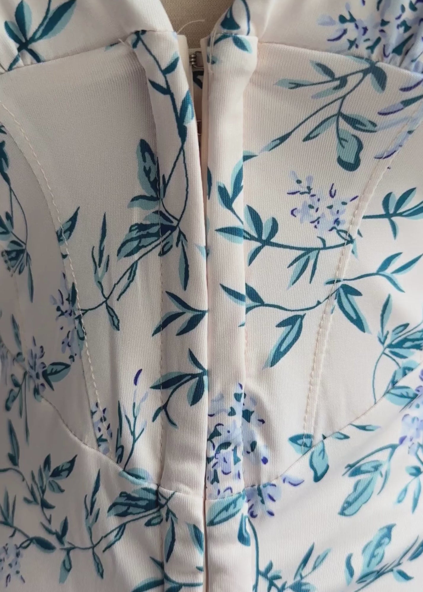 Floral printed mini dress with long sleeve puffed detailing, V-neck and fitted look, pleated and elastic waist